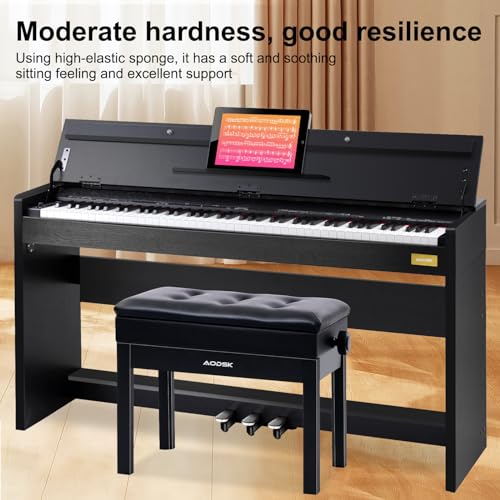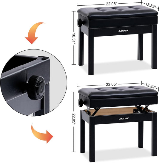 AODSK Adjustable Wooden Piano Bench with Padded Cushion and Storage with Sheet Music Storage Black 22.05''x13.39''x18.31''(Height Adjustable Range:18.31''-22.05'')