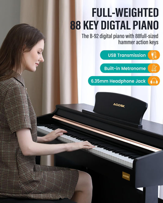 AODSK Digital Piano 88 Key Full Size Weighted Keyboard Overall Solid Wood Frame for Beginners with Sheet Music Stand Triple Pedal Power Adapter