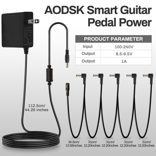 AODSK Guitar Pedal Power Supply Adapter,Guitar Pedal Power Supply Adapter 9V DC 1A,5 Way Daisy Chain Cables