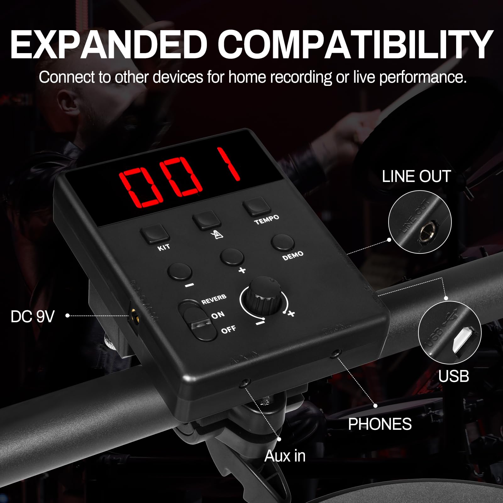 - [Multiple Modes To Choose From]:Extensive sound system arrives,built-In metronome & countless other preloaded kits,easy-read LED display & Headphone output mode,external speaker system,USB MIDI interface,AUX input interface